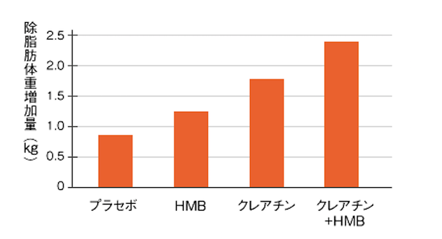 またHMBと併用することで、除脂肪体重の増加量を加速させることができます。除脂肪体重とは体重から体脂肪の重さを除いた値で、引き締まった体型を作るために重要な指標です。